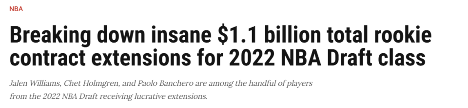 尽管续约人数(9人)少于上赛季同期的11人,但本届新秀的质量堪称历史级。9份合同总金额突破11亿美元,其中5人获得2.41亿美元起跳的顶薪合同,创下新秀续约金额新纪录。