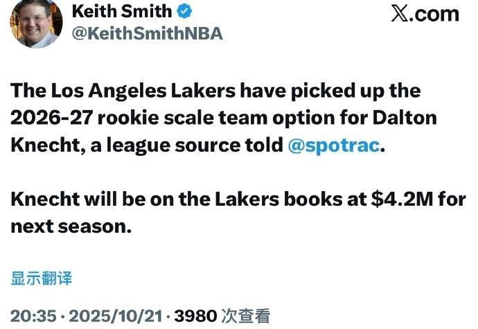 北京时间10月21日,据NBA知名记者Keith Smith报道,洛杉矶湖人队已正式执行24岁年轻球员克内克特2026-27赛季价值420万美元的球队选项。然而,这位2024年首轮17号秀自上赛季交易告吹后重返湖人,状态持续下滑,在季前赛中的表现被外界批评为“负资产”,湖人若想将其交易,或将面临诸多困难。